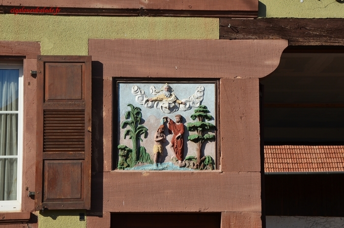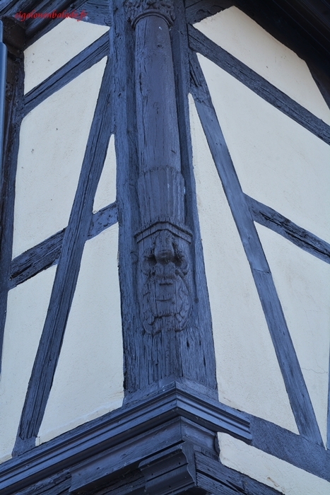 Le poteau cornier (Eckpfoschte) est orné d’un ange sculpté.