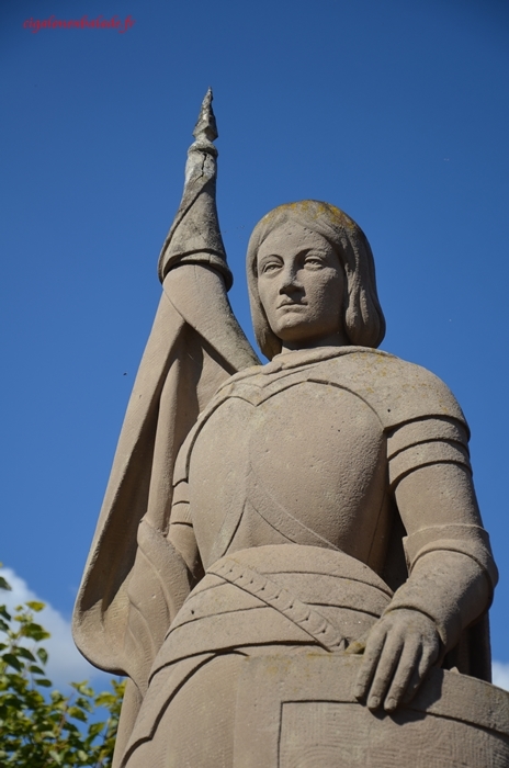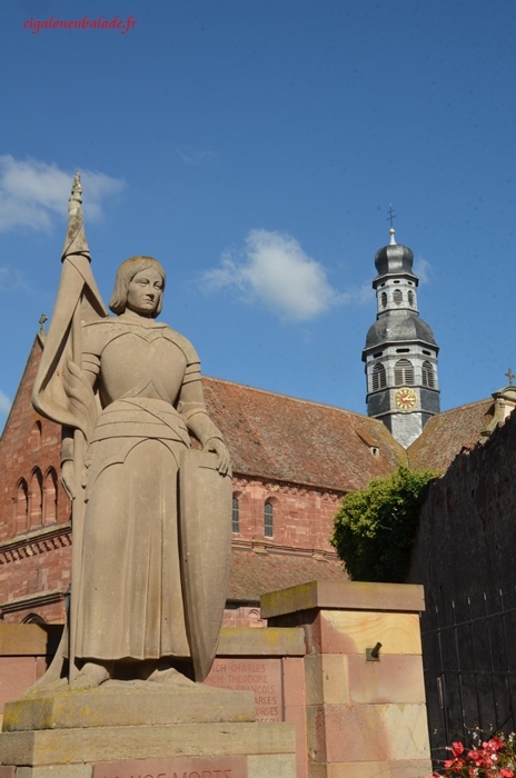 L’abbatiale se profile à l’horizon, derrière la statue de Jeanne d’Arc.