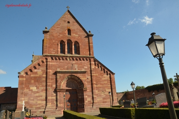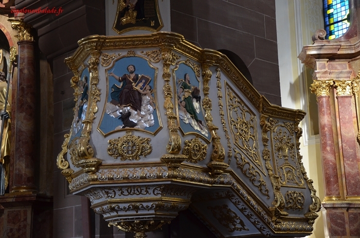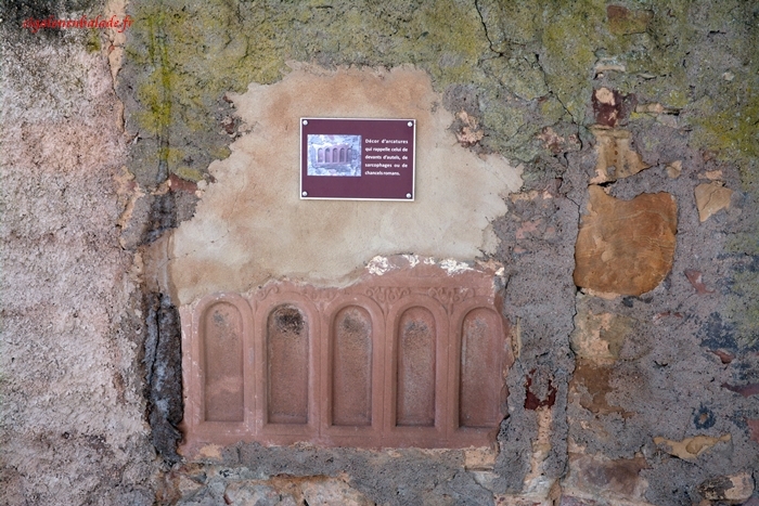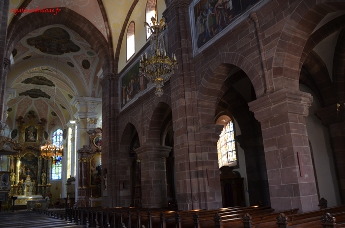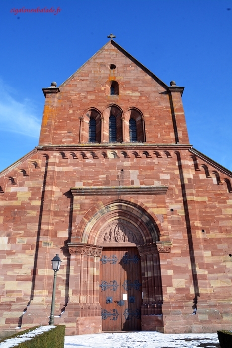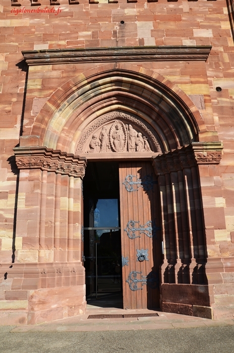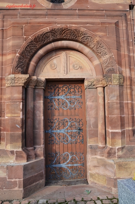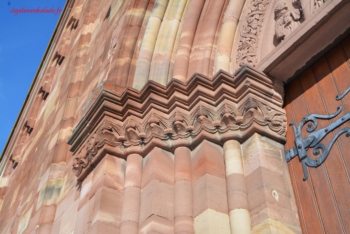 L’abbatiale, construite en grès rose, en impose par sa taille mais les décorations restent peu nombreuses. Sous la toiture, une frise de feuillages et de palmes.