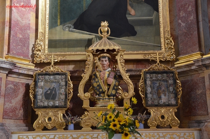 Sur l’un des autels du transept nord, je découvre un reliquaire en bois sculpté représentant le buste de Saint-Cyriaque. La poitrine du saint est recouverte d'écailles de métal. Elle renferme les reliques du saint, un bras.