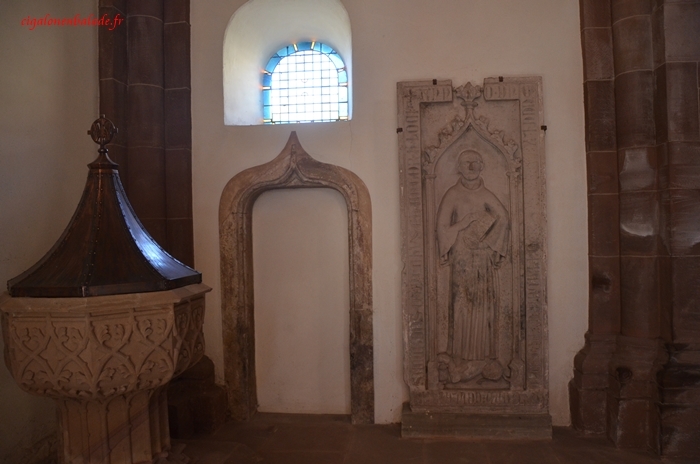 Les fonts baptismaux sont de style gothique et côtoient une dalle funéraire de 1509 d’un moine de l’abbaye, le frère Conrad de Gougenheim, cellérier et chantre, mort en 1360. C’était le responsable des finances du monastère et du déroulement des offices religieux.