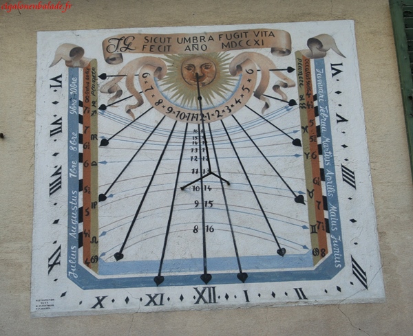 Beau cadran solaire rénové pour la dernière fois en 1977. Sur le ruban qui porte les initiales de son créateur, une citation latine rappelle que le cadran a été fait en 1711 et que «la vie fuit comme une ombre».