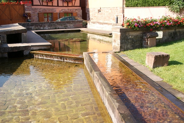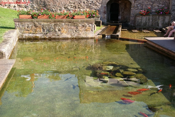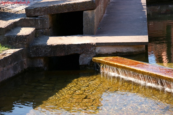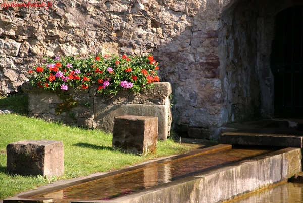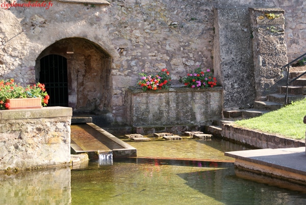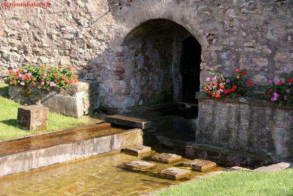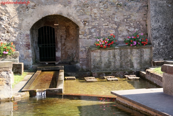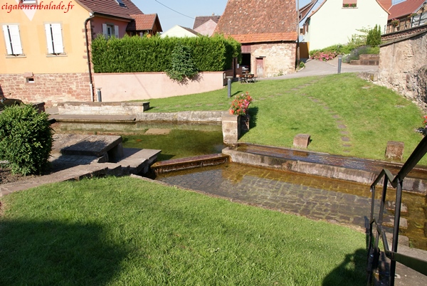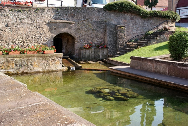 A l’origine, deux sources jaillissaient de la montagne, du Berg, comme on dit ici. Pour capter leur eau, une fontaine, à ciel ouvert a été construite dès le IIIème siècle après JC. En 1537, on procède à la construction de deux galeries voutées permettant de recueillir l’eau et de l’écouler vers un bassin. Personne ne sait exactement où conduit le souterrain romain qui l'alimente. Ce n’est qu’en 1758 qu’un lavoir public est aménagé, remplacé en 1875 par un lavoir neuf, rénové en 2002. C’est dans cet état que nous le trouvons aujourd’hui. Le beau temps incite les villageois à venir s’asseoir au bord. J’attends leur départ pour prendre des photos.