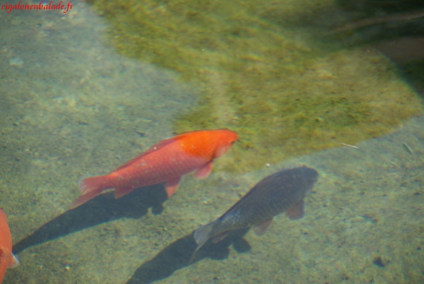 L’eau sort d’un tunnel grillagé qui vient de traverser la route, tombe dans un premier bassin allongé puis se verse dans un second bassin rectangulaire dans lequel nagent paisiblement des poissons rouges et noirs.