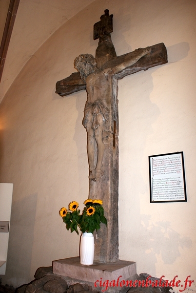 L’entrée pour la visite se fait par le côté nord. Une magnifique croix de pierre sculptée en 1480 pour les Chartreux de Kœnigshoffen accueille le pèlerin. Haute de 4,50 m et large de 2,10 m, elle représente un Christ au visage paisible.