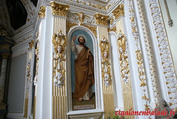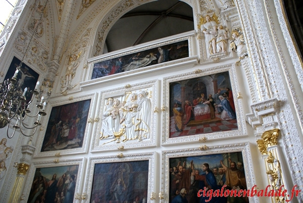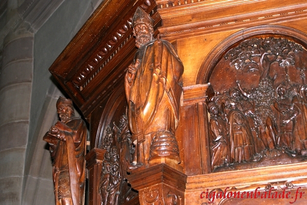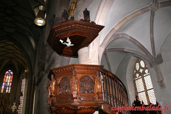 La chaire de 1631 est ornée de statues de saints.