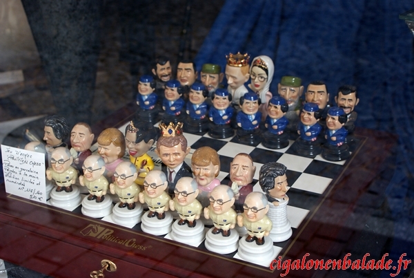 Dans une vitrine, nous découvrons un échiquier comme celui que nous avons vu parmi les cadeaux offert au président Chirac. B. Bhutto côtoie F. Castro et d’autres encore.