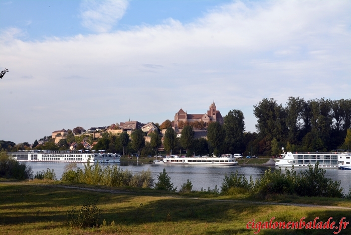 Belle fin de journée avec en sourdine le bruit des moteurs des bateaux de tourisme qui jettent l’ancre à Vieux-Brisach, juste en face !