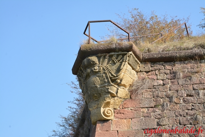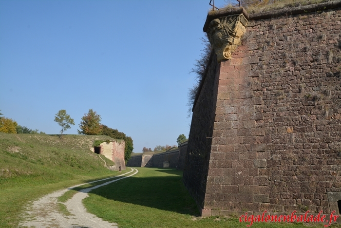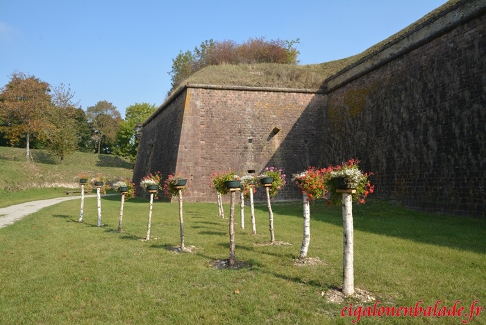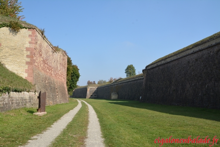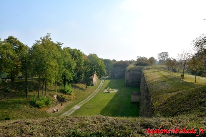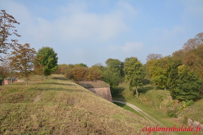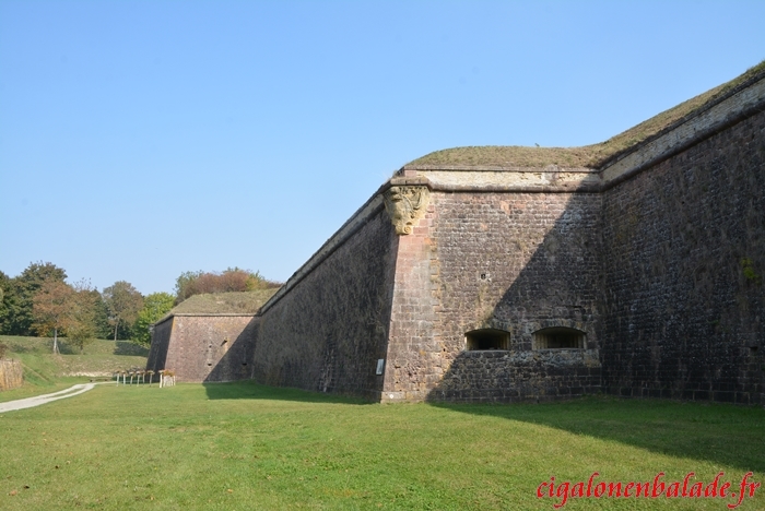 Nous longeons des courtines, passons devant une contre-garde. Chaque pièce du système défensif est expliquée sur des panneaux émaillés.