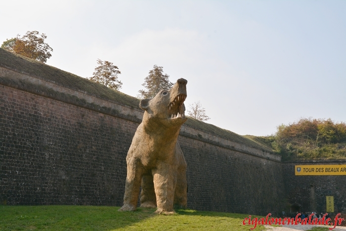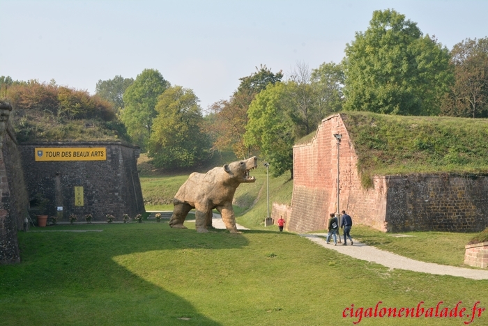 Les fossés servent de musée à ciel ouvert. Un ours géant faisant partie de Remp’Art, festival international de Land Art se dresse à l’horizon. La grosse bête faite de ferraille et de paille impressionne un instant Noa mais l’envie de muloter est bien plus forte.