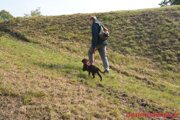 Nous commençons par grimper sur le talus, histoire de surplomber les fossés. On peut parcourir une petite distance mais des ouvrages interrompent vite la promenade.