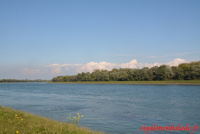 Pour profiter néanmoins de cette belle journée chaude et ensoleillée, nous refranchissons la frontière et nous nous installons sur l’île du Rhin de Biesheim. Quelques camping-cars sont déjà stationnés mais nous trouvons de la place facilement.
