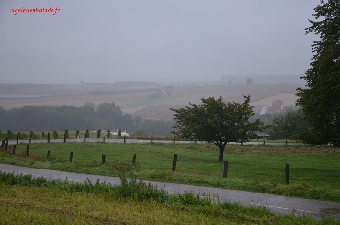Lorsque nous émergeons du camping-car, il fait à peine jour et il commence à bruiner. La nuit a été bonne mais courte ! S’en suit alors une longue attente de plus de 2h sous une pluie qui ne cesse de se renforcer. Heureusement que nous sommes équipés : sièges, chaussures de marche et pèlerines …