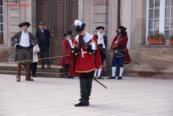 Alors que les costumés déambulent dans les rues de Rosheim, les mousquetaires de la troupe Quinte Septime de Metz animent les placettes et jouent de la pointe de l’épée.