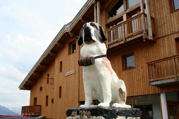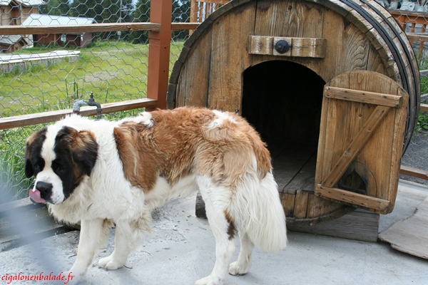 A la sortie du bourg, il ne reste qu’un seul St Bernard dans l’enclos alors qu’il y avait toute une meute lors de notre dernier passage. Il faut dire qu’il remonte à …. très, très longtemps. Nous en profitons pour le prendre en photo et pour mettre une pièce dans la tirelire accrochée au grillage.