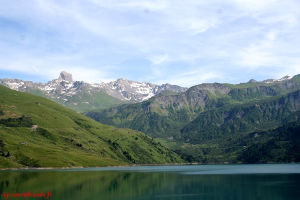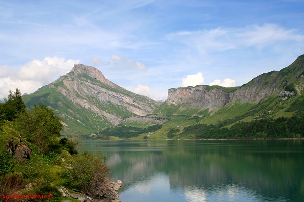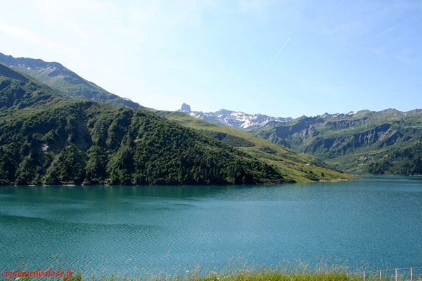Le lac de Roselend est entouré de montagnes qui avoisinent les 2800 m. Autant que les alpages sont verdoyants, autant le lac est bleu émeraude, signe d’une grande profondeur.