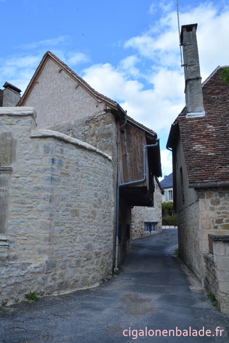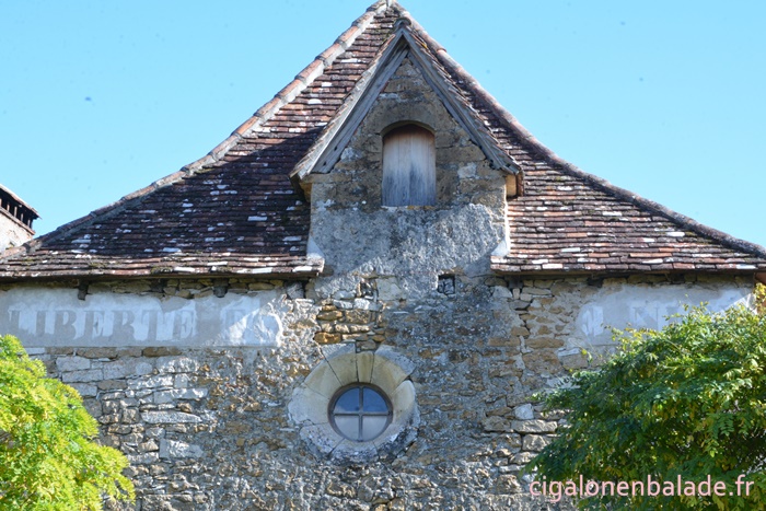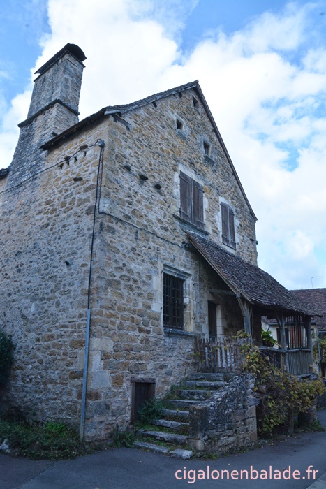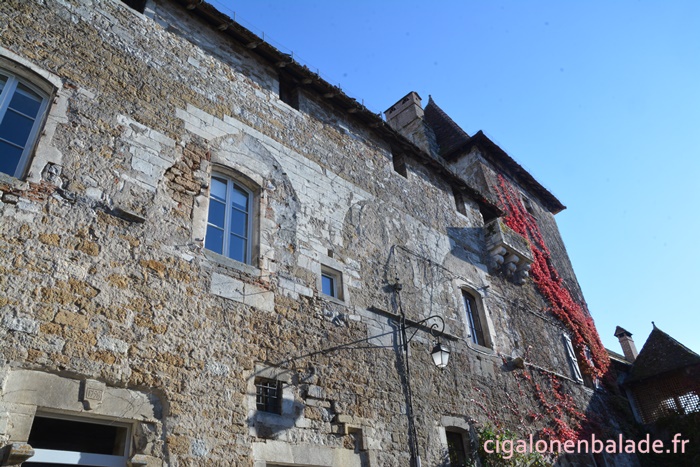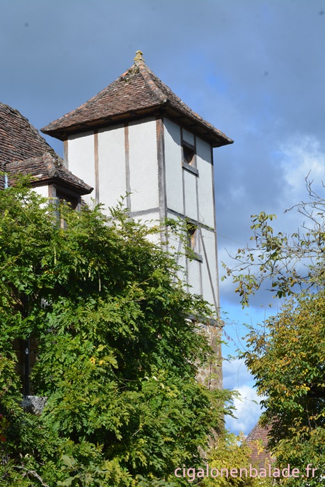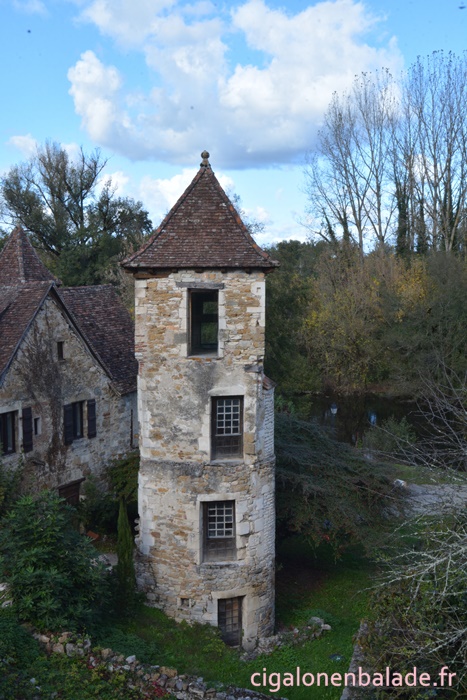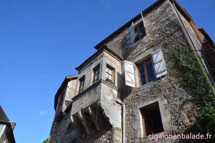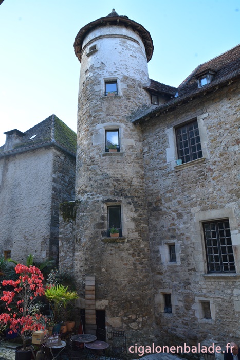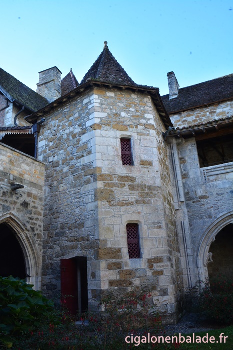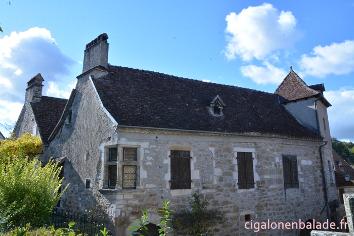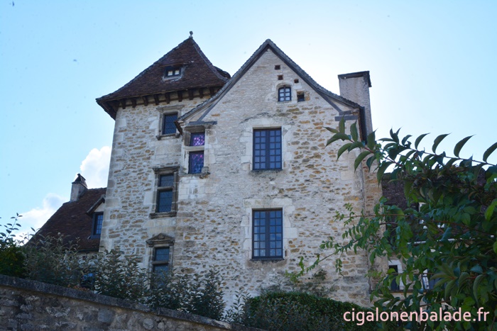 Nous passons devant la façade du logis de style Renaissance avec ses tourelles d’angle et ses fenêtres à doubles traverses et meneaux. L’édifice abrite de nos jours l’Espace Patrimoine du Pays d’Art et d’Histoire Causses et Vallée de la Dordogne, fermé ce jour-là.