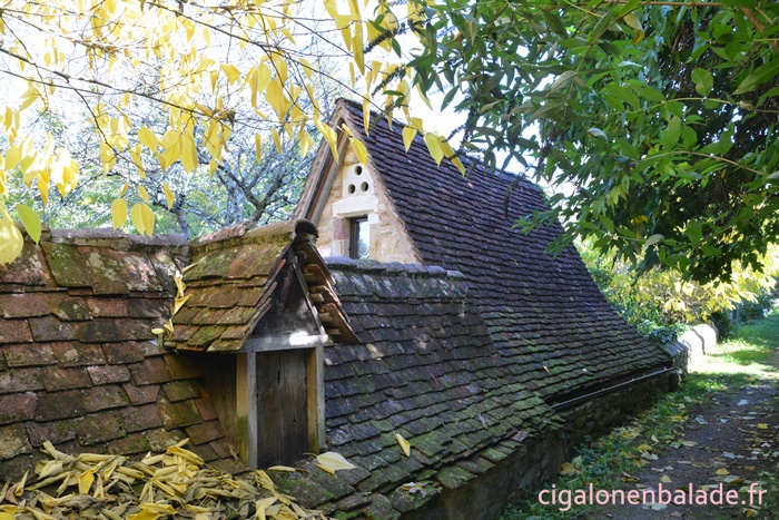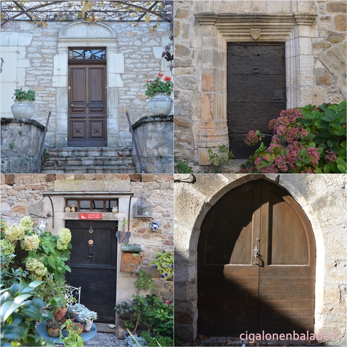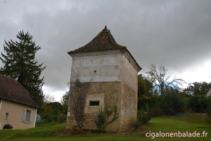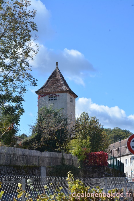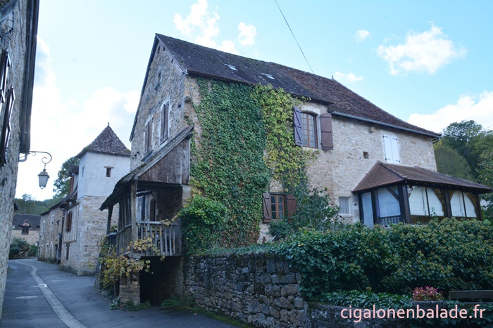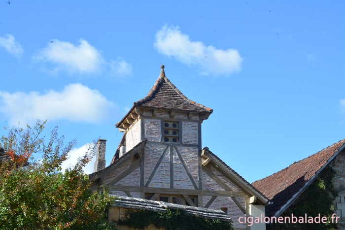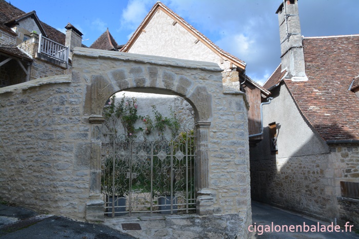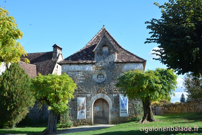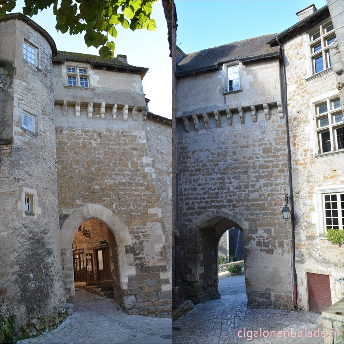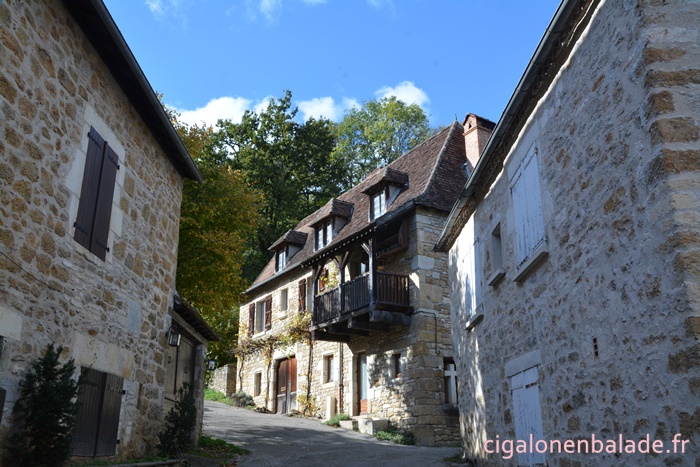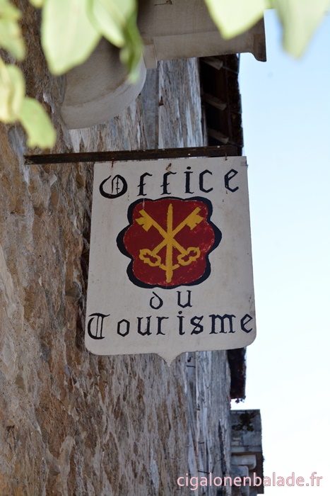 Nous passons devant la façade du logis de style Renaissance avec ses tourelles d’angle et ses fenêtres à doubles traverses et meneaux. L’édifice abrite de nos jours l’Espace Patrimoine du Pays d’Art et d’Histoire Causses et Vallée de la Dordogne, fermé ce jour-là.