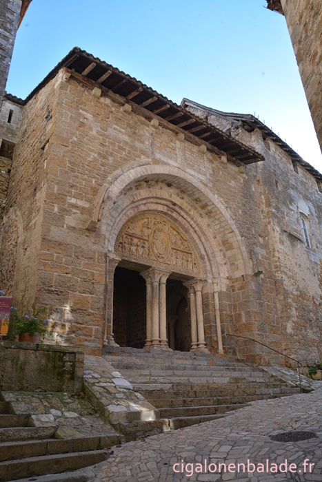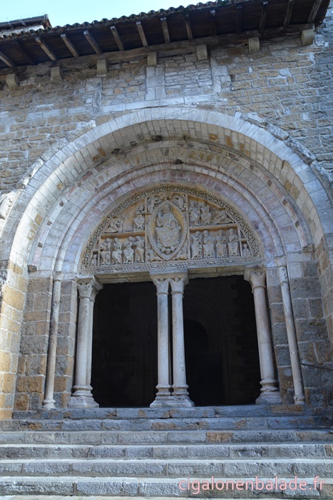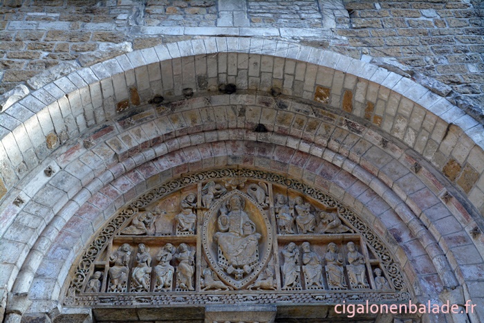 Un siècle plus tard, on lui rajoute un porche qui présente un tympan sculpté du Christ en majesté entouré par les symboles des 4 évangélistes (l’ange de Matthieu, l’aigle de Jean, le taureau de Luc, le lion de Marc) et par les apôtres répartis sur 2 registres. Le style est fortement inspiré par les tympans de Moissac et de Cahors