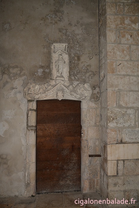 Porte surmontée d’une coquille St Jacques. Les deux pilastres plats de la porte sont coiffés de chapiteaux inspirés du corinthien.