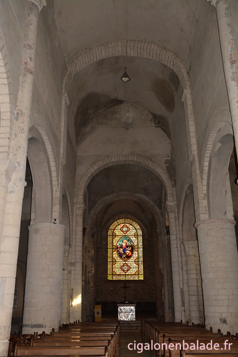 La nef, en plein cintre, est couverte d’une voûte en berceau supportée par quatre gros piliers cylindriques flanqués de colonnettes qui reçoivent les retombées des arcs doubleaux s'ouvrant sur les bas-côtés.