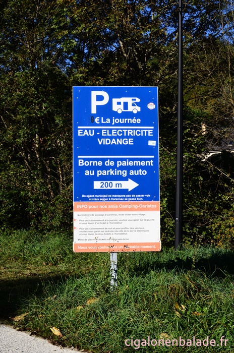A Carennac, un parking est réservé aux voitures, payant et un peu plus loin un autre pour les camping-cars. Difficile de comprendre la tarification ! Je téléphone donc à l’OT pour obtenir des informations supplémentaires.