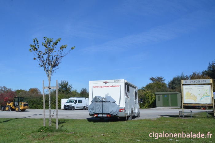 Un grand parking nous attend à l’entrée, malheureusement encombré par l’entreprise qui fait des travaux de voirie, sinon y passer la nuit aurait été possible.