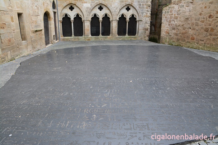 Nous arrivons place des Ecritures, une très belle place intimiste consacrée à Champollion avec une grande dalle à degrés, reproduction de la pierre de Rosette, conçue à l'arrière du musée par l'artiste américain Joseph Kosuth pour le bicentenaire de la naissance du déchiffreur (1990). Elle m’avait tant plu lors de notre première visite qu'il fallait absolument qu'on y retourne. C'est chose faite !