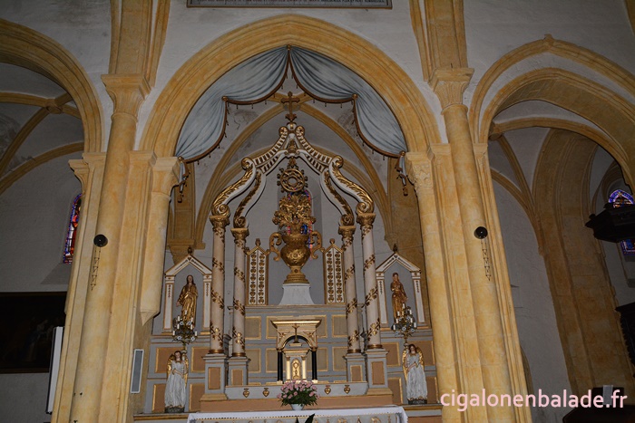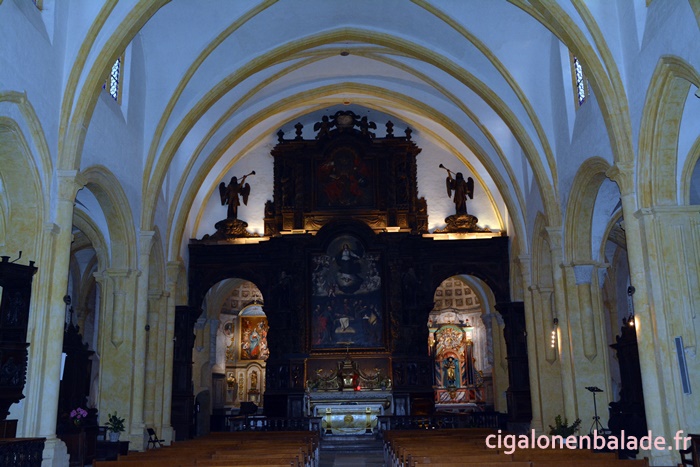 Dans le chœur, le plus grand retable du Lot en bois de noyer du XVIIème siècle consacré à la Vierge. Il représente l'Assomption et a été exécuté par un peintre figeacois, Lofficial, en 1683. La Vierge est portée par des anges et encadrée par des statues de moines qui ont remplacé, après la Révolution, celles de St-Pierre et St-Paul, pères de l’Église.