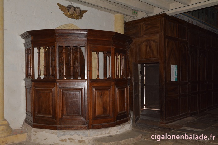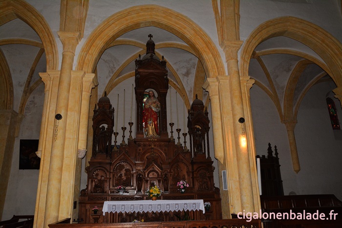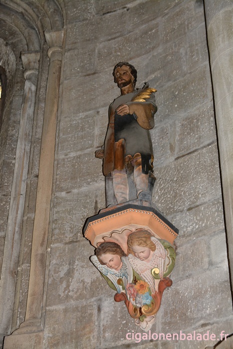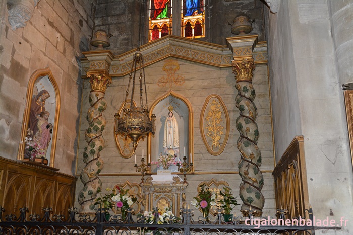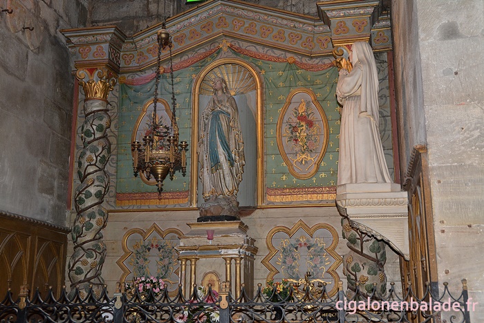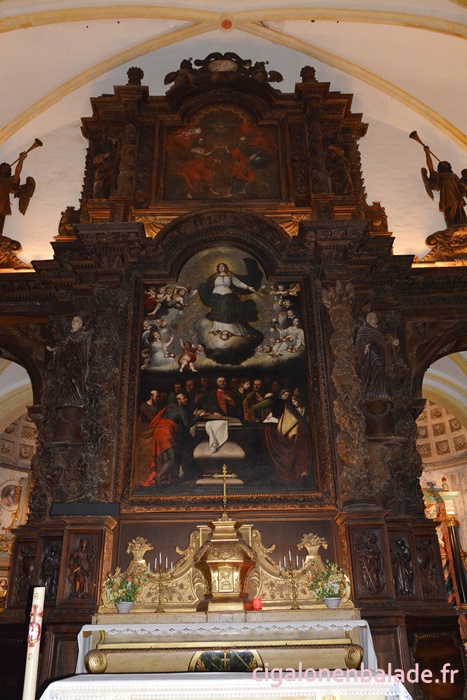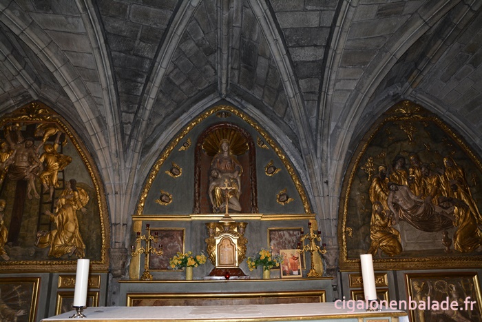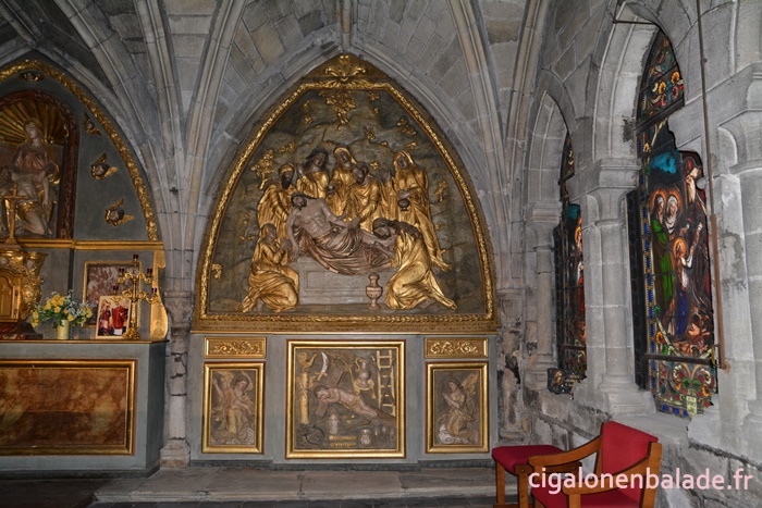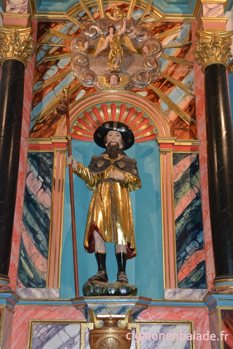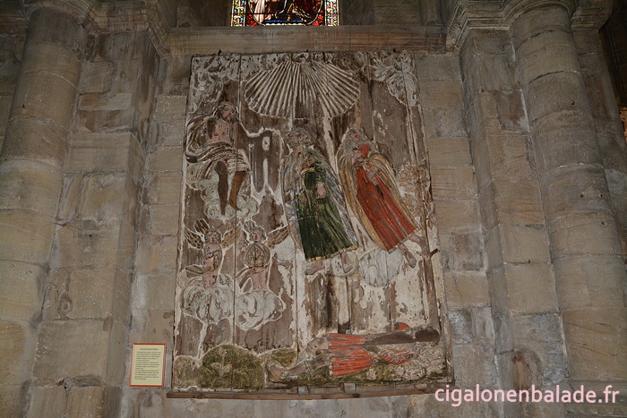 Dans la première absidiole, un autel consacré à Saint-Jacques bien plus coloré que le grand retable indique que l’église servait de siège à la confrérie St-Jacques.