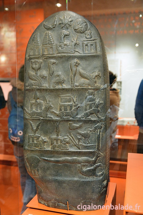 Copie d’un kundurru *qui marque les dotations de terres faites par le roi. La stèle était certainement érigée sous la protection des dieux qui y figurent.