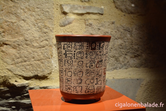 La panse du vase est couverte de glyphes (représentation graphique d’un signe typographique maya, d’un caractère) donnant une liste de souverains associées à des dates.