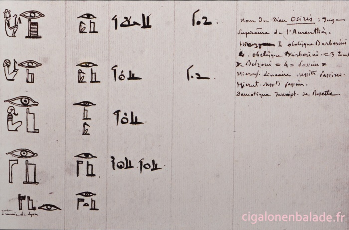 Étude des correspondances entre les 3 écritures : nom d’Osiris tracé en hiéroglyphes soigneusement tracés, en hiéroglyphes simplifiés, en hiératique et en domotique (les 3 évolutions de l’écriture égyptienne)