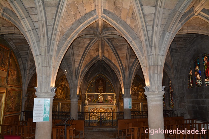 Quatre courtes colonnes rythment les neuf travées de la chapelle. Remarquable par ses proportions, elle ne l’est pas moins par son décor de bois sculpté et peint, œuvre des Delclaux, famille de sculpteurs figeacois, représentant la Passion du Christ et de la Vierge.