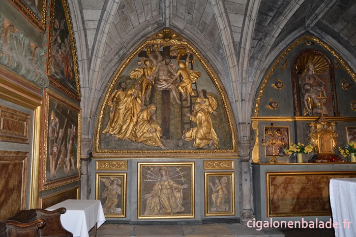 De chaque côté, deux grands panneaux peints et dorés représentent la Descente de croix et la Mise au tombeau. Le registre inférieur est orné, à gauche, de la Vierge des sept douleurs, dont le corps est transpercé par sept glaives et à droite, de l'Enfant Jésus endormi sur la croix, entouré des instruments de la Passion, iconographie peu commune.