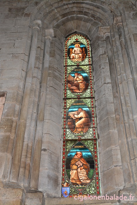 L'ensemble des vitraux de l'église a été posé en 1872 par l'atelier Villiet de Bordeaux. Entre le bras du transept nord et le chœur, les arts : théologie, musique, architecture et histoire, personnifiés par des moines.