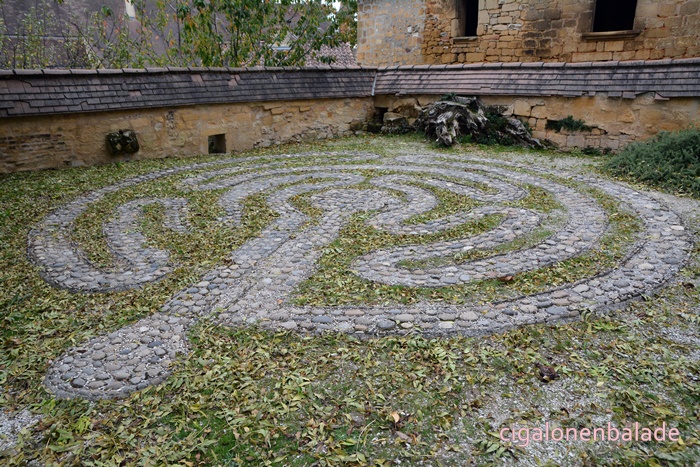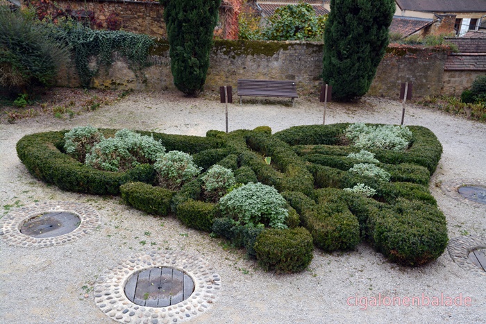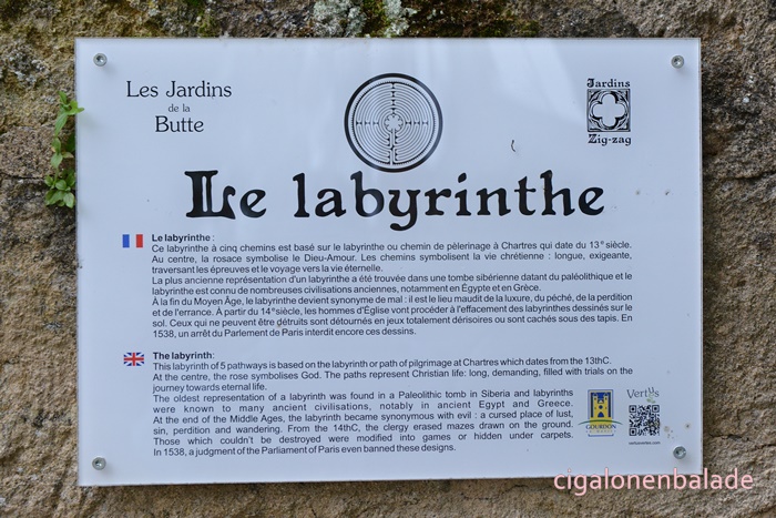A l'arrière de la maison du sénéchal, par la rue zig-zag, nous entrons dans les jardins de la Butte, une série de jardins thématiques. Ces jardins sont aménagés dans l'esprit d’un jardin du temps de Charlemagne. Le labyrinthe en calade est basé sur le chemin de pèlerinage de Chartres du XIIIème siècle. Un panneau nous permet de mieux l'appréhender.