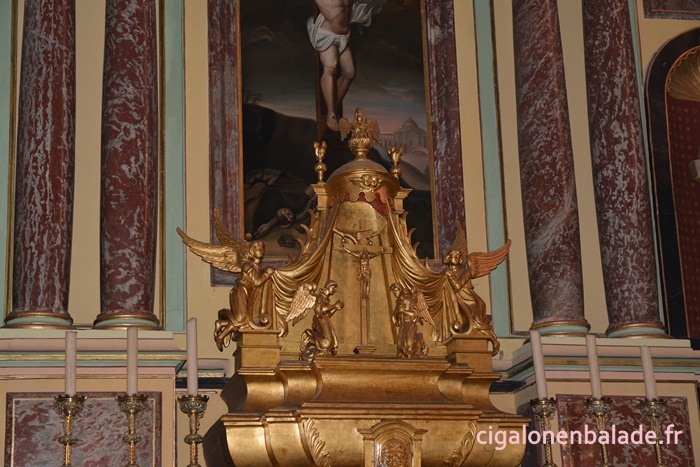 Dans le chœur, le retable du maître-autel polychrome, fait de différents marbres, de pierre calcaire et de bois doré est achevé en 1714.