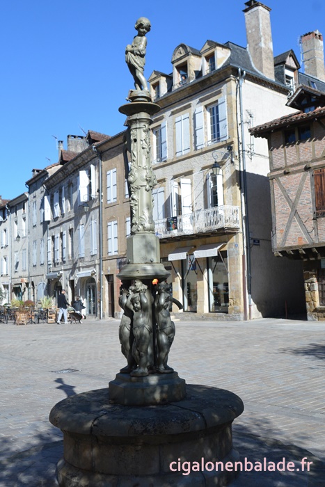 Nous arrivons sur la place du Mercadial, classé aux MH, et ses jolies maisons médiévales. C'est une place élégante ponctuée en son milieu par une gracieuse fontaine où quatre chérubins, sous l'oeil attentif d'un enfant, soutiennent la colonne contre laquelle est apposée le levier de pompage.