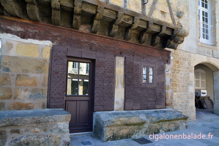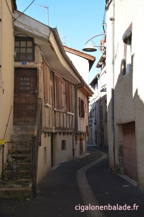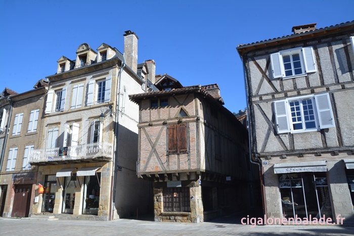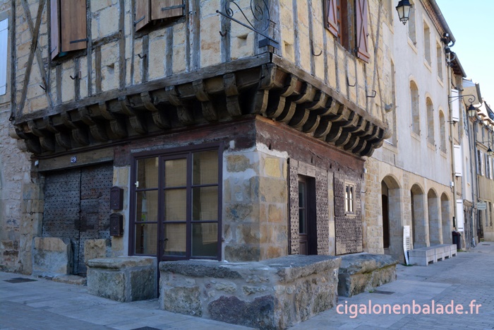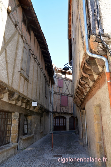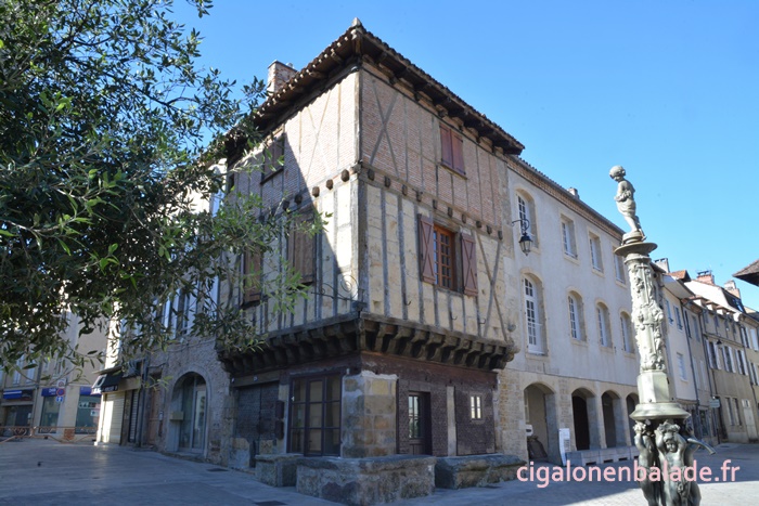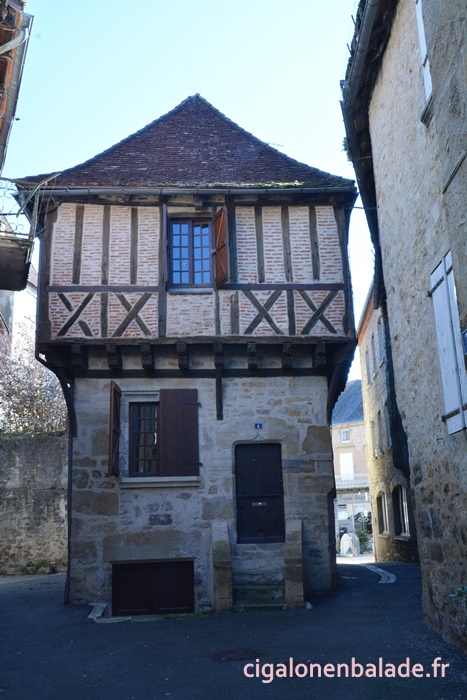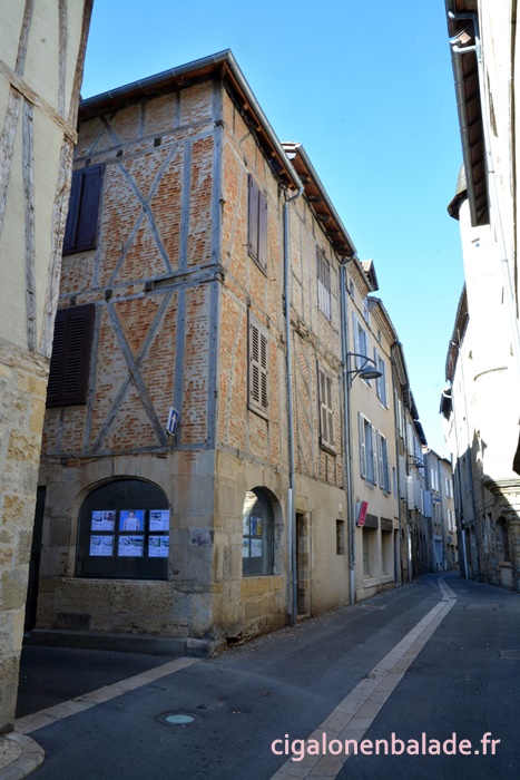 En sortant de l'église, nous empruntons la rue Paramelle et découvrons à nouveau une jolie maison, comme celle de la place du Mercadial : étroite, étage à encorbellement, pans de bois, remplissage en briques.