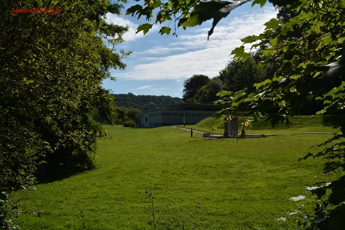 Sur place, nous nous garons devant le stade, sur le parking conseillé aux randonneurs. Il n'est pas encore 10h et il fait déjà bien chaud. Le circuit est balisé par des panneaux explicatifs et prospectus en main, nous partons d'un bon pied.