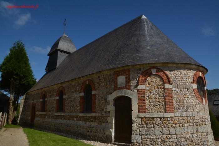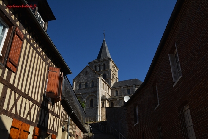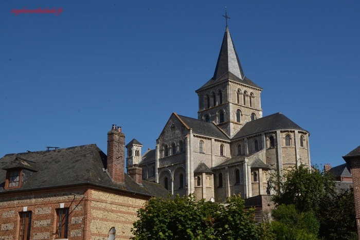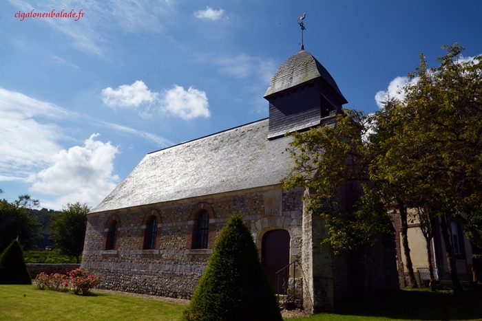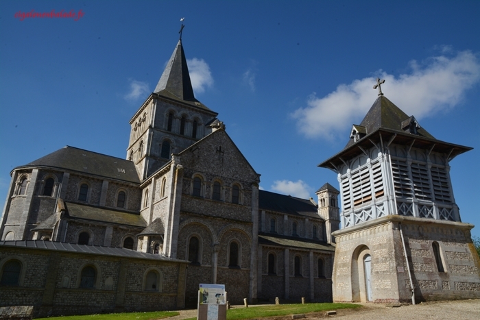 Le village est dominé par l'église St-Denis qu'on ne peut pas louper tant elle est imposante. C'est la réplique de l'église de l'abbaye St-Martin de Boscherville. Dommage, elle est fermée car j'aurais bien voulu voir les cinq statues déterrées récemment dont celle de St Denis portant sa tête, qu’elle abrite.