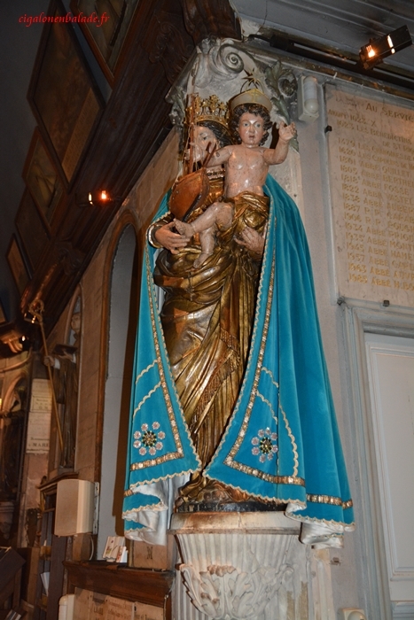 En pénétrant dans l’église, je suis d’abord surprise par sa luminosité et sa taille mais aussi par sa double nef (1468-1496) dont la construction était devenue nécessaire à cause de l’essor démographique. Au début du XIXème siècle, l’intérieur de l’église a reçu un habillage en plâtre et le porche a adopté un style néo-classique à colonnes grecques. D’important travaux de restauration ont été entrepris en 1879 et ont consisté à ôter à nouveau le plâtre et à remplacer le porche. C’est ainsi que nous apparaît l’église à présent. On dit bien que faire et défaire, c’est aussi travailler !