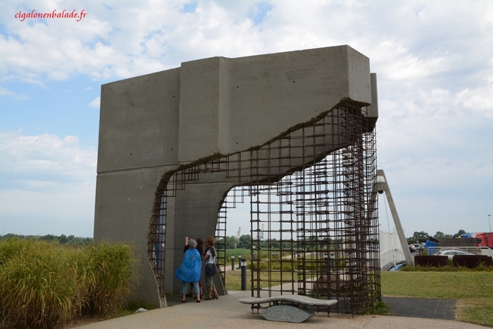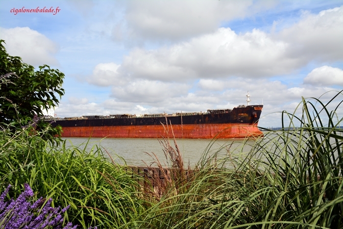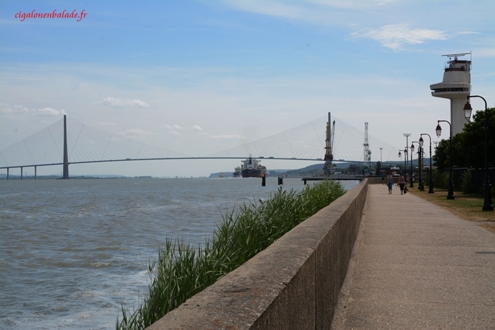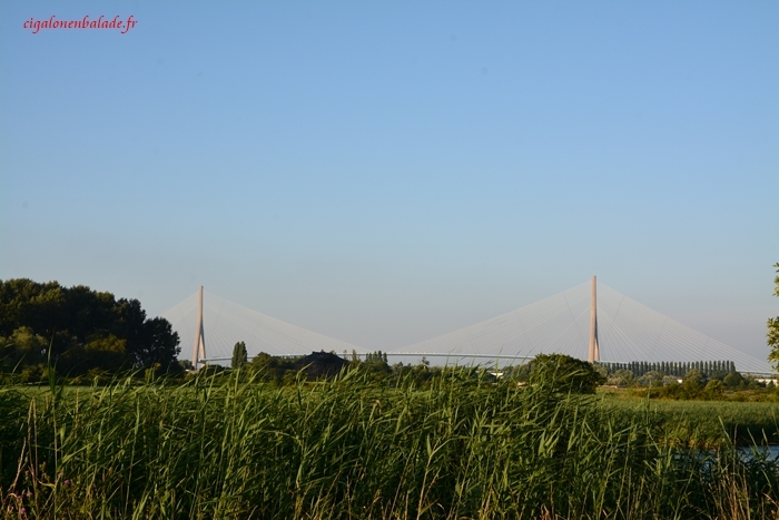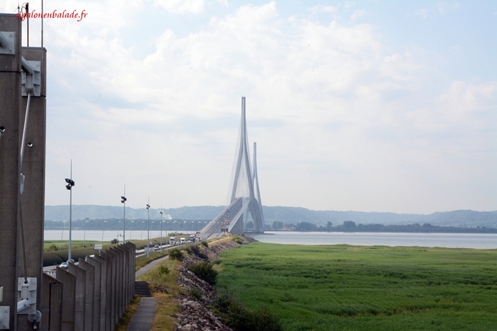 arrivée au pied du pont de Normandie, le dernier pont sur le Seine où nous nous arrêtons pour prendre quelques photos et consulter les panneaux explicatifs sur cet édifice hors normes.
