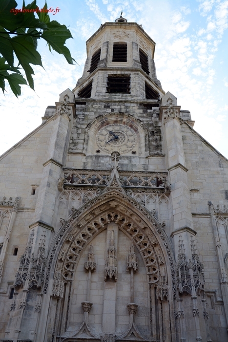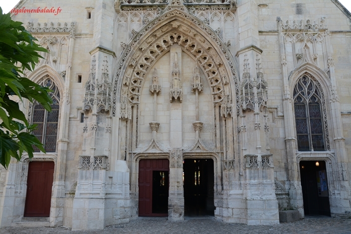 Le portail de style flamboyant est décoré dans sa partie supérieure d’instruments de musique.