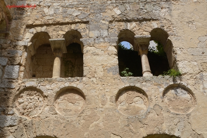 Au-dessous de petites baies géminées typiques de l’art pré-roman, une série de 6 médaillons dont les décors ont pratiquement disparu encadrent l’entrée.