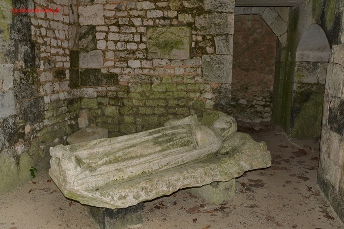 Le gisant en habits du XVème siècle de Marie de Ferrière repose dans une chapelle latérale, la tête posée sur un coussin. À ses pieds, deux chiens se disputent un os.