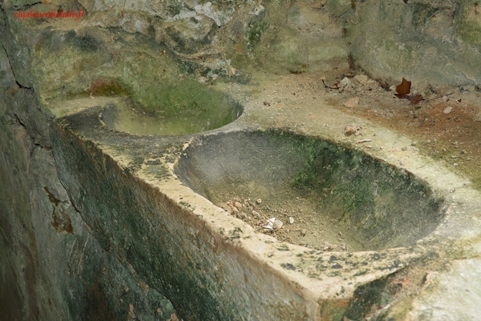 La sacristie donne directement dans le cœur de l’église afin que le prêtre ne croise pas les moniales. On y voit encore deux piscines creusées dans la pierre et au ras du sol, une pierre de consécration ornée d'une croix. Il faut la voir et nous mettons un petit moment pour la découvrir.
