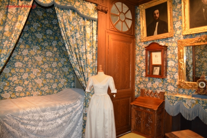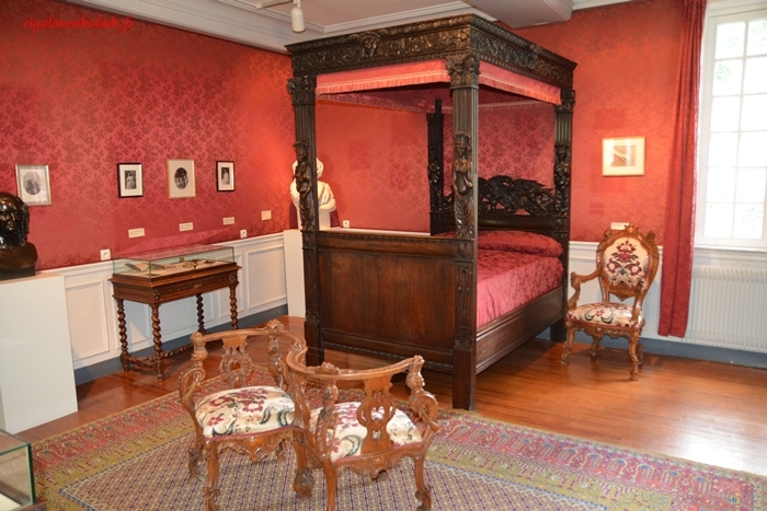 La chambre suivante est oppressante par les couleurs sombres de la tapisserie, le semblant de fouillis qui y règne, le peu de lumière qui y pénètre! C’est la reconstitution de la chambre du couple Vacquerie au Havre.