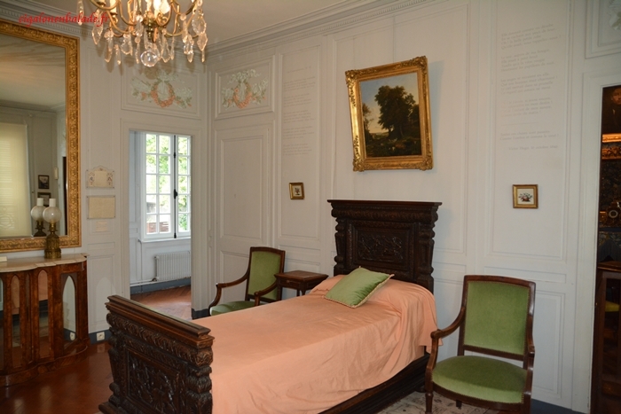 Dans la chambre « Léopoldine Hugo-Vacquerie » c’est le couple qu’elle formait avec Charles Vacquerie qui est évoqué : leur vie au Havre, le drame du naufrage, la correspondance de Léopoldine …. Le lit provient de la maison d’un ami, Paul Meurice, chez lequel Hugo séjournait à Veules-les-Roses.